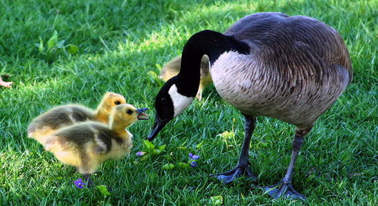One evening we walked down a side street that led to a small stream with birds in abundance. There we found a special surprise--two mother ducks and their respective progeny. There were four young in each brood. One group was more mature and already getting feathers. The other ones were still fuzzy and called to their mother with immature peeps from their perch on a rock. She came right to them and they jumped clumsily into the water, peeping wildly. They swam away, content to be in the presence of their mother.